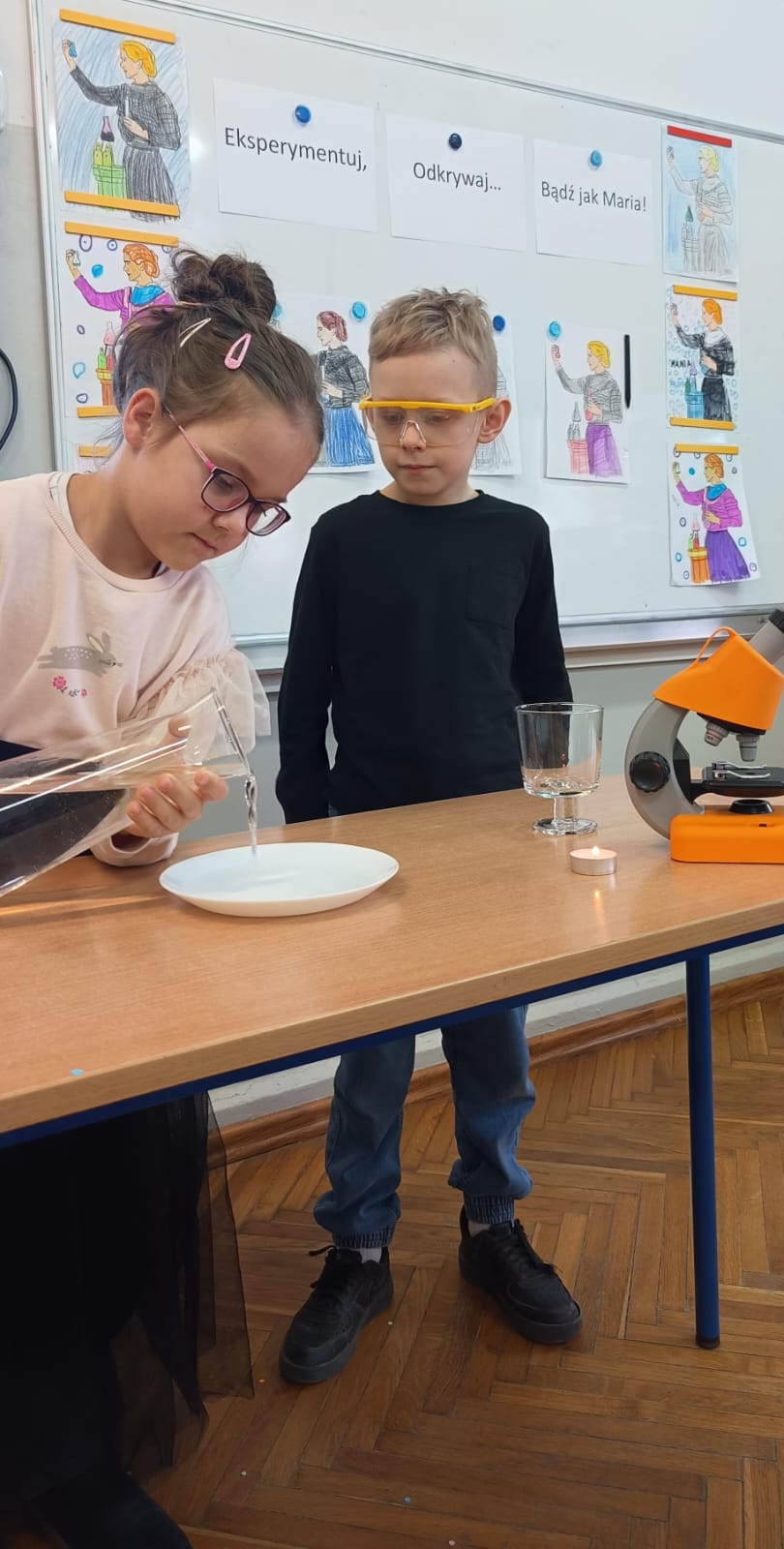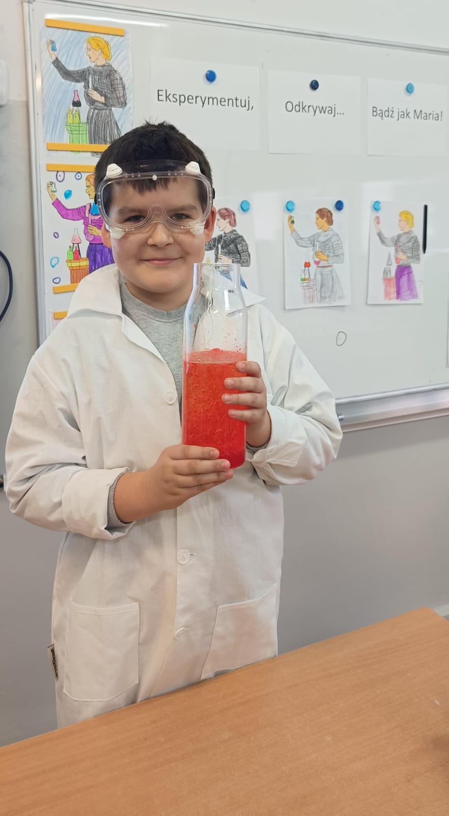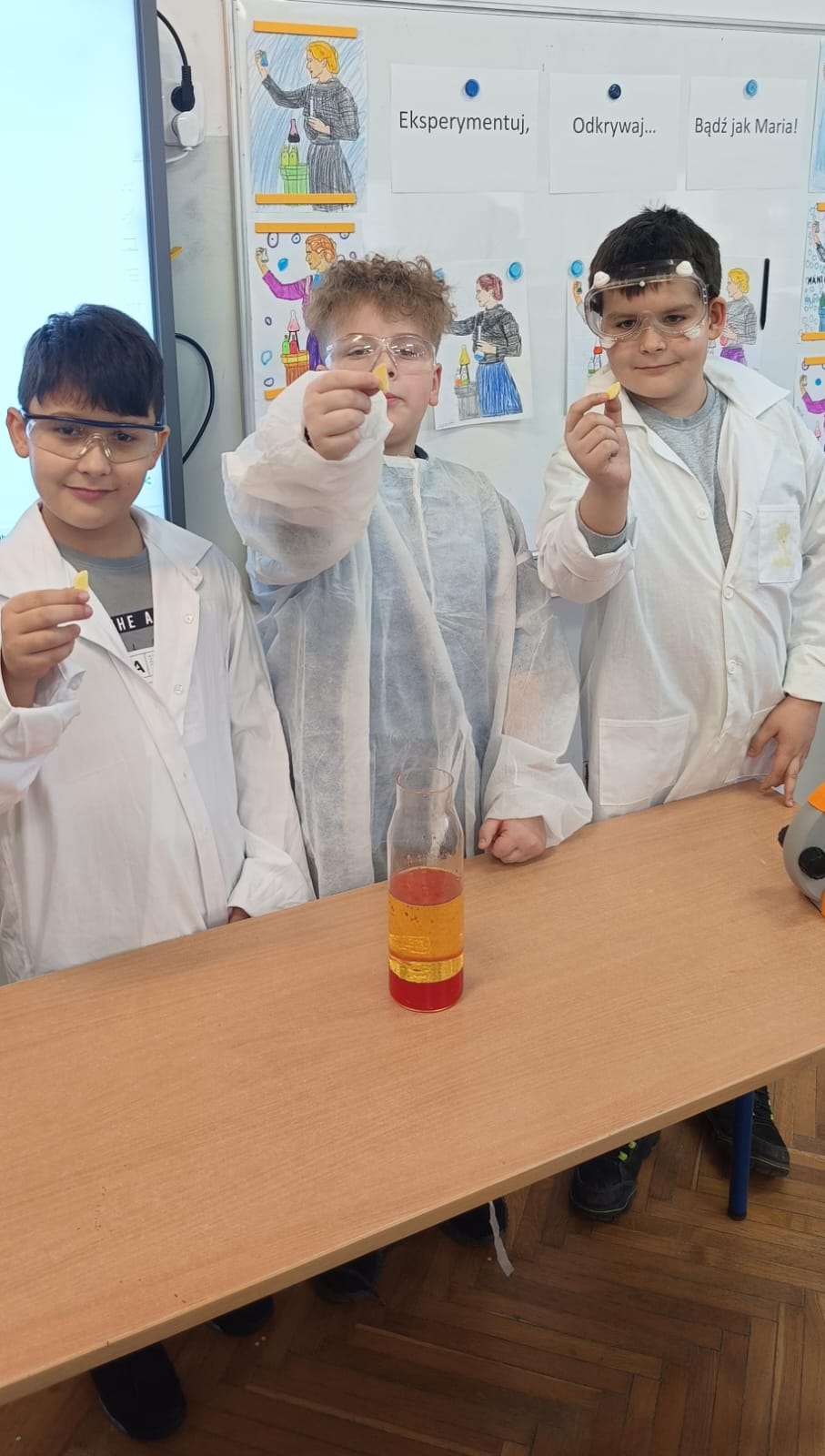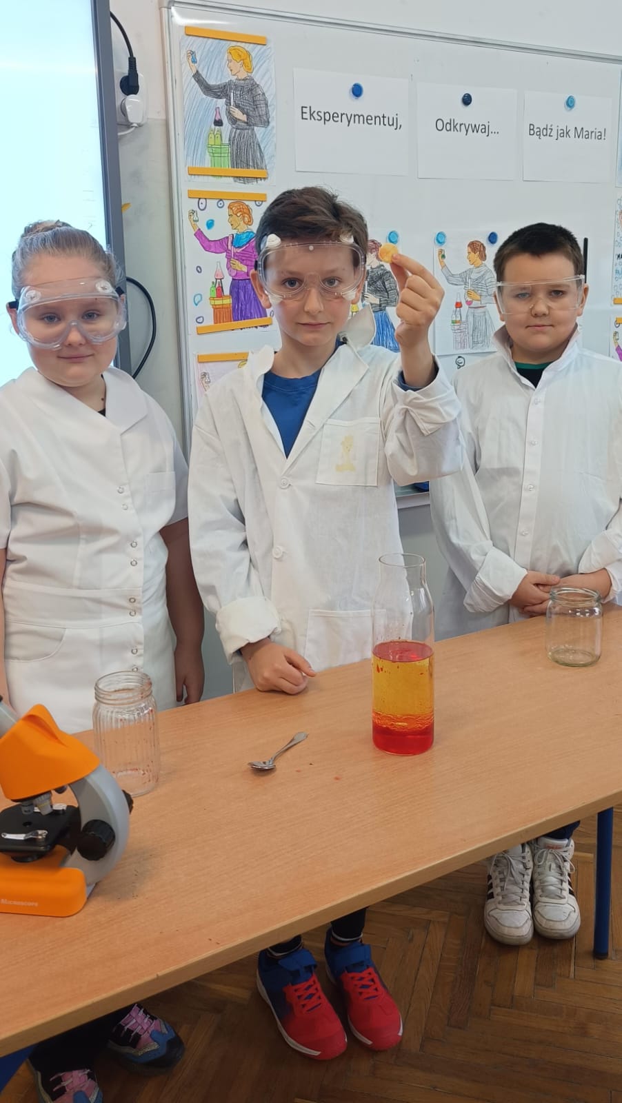 Sala lekcyjna zamieniła się w laboratorium, a nasi uczniowie w fantastycznych naukowców. Mogliśmy poczuć się jak Maria Skłodowska-Curie.