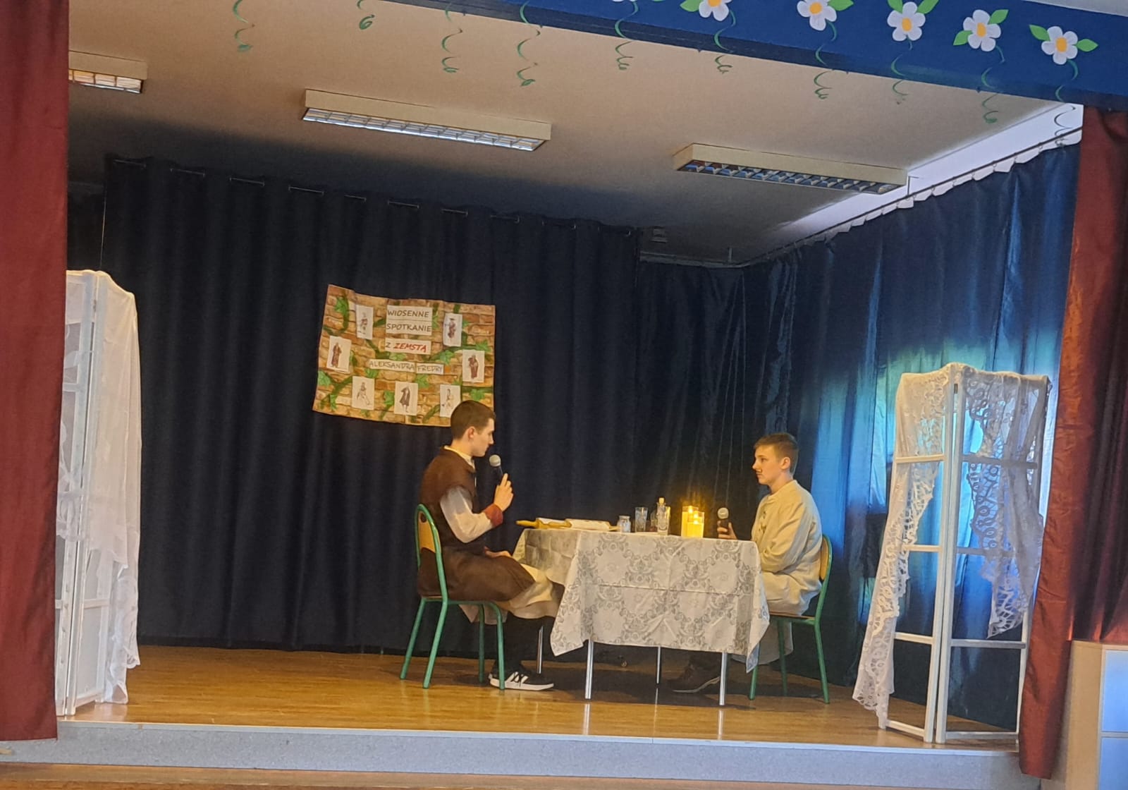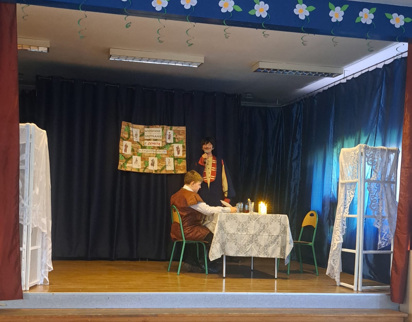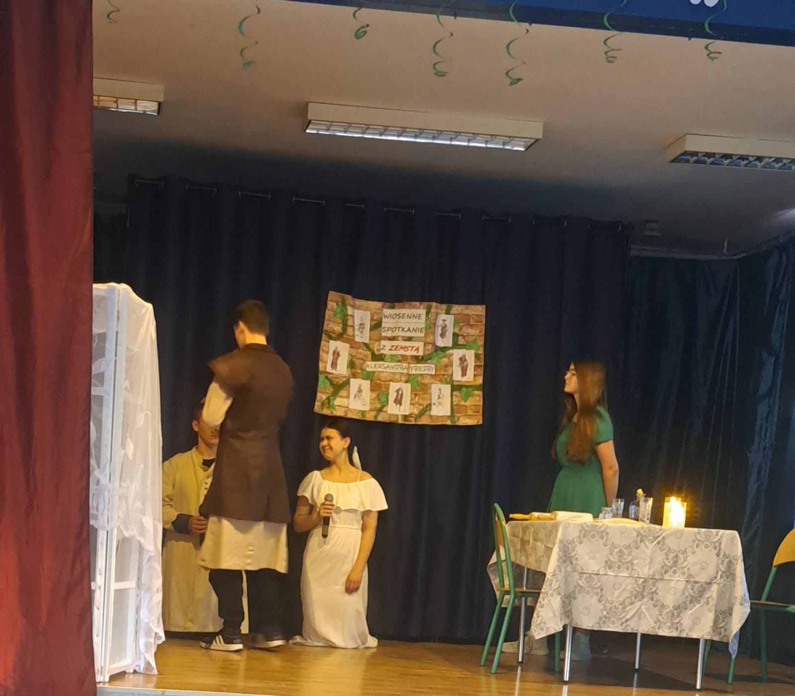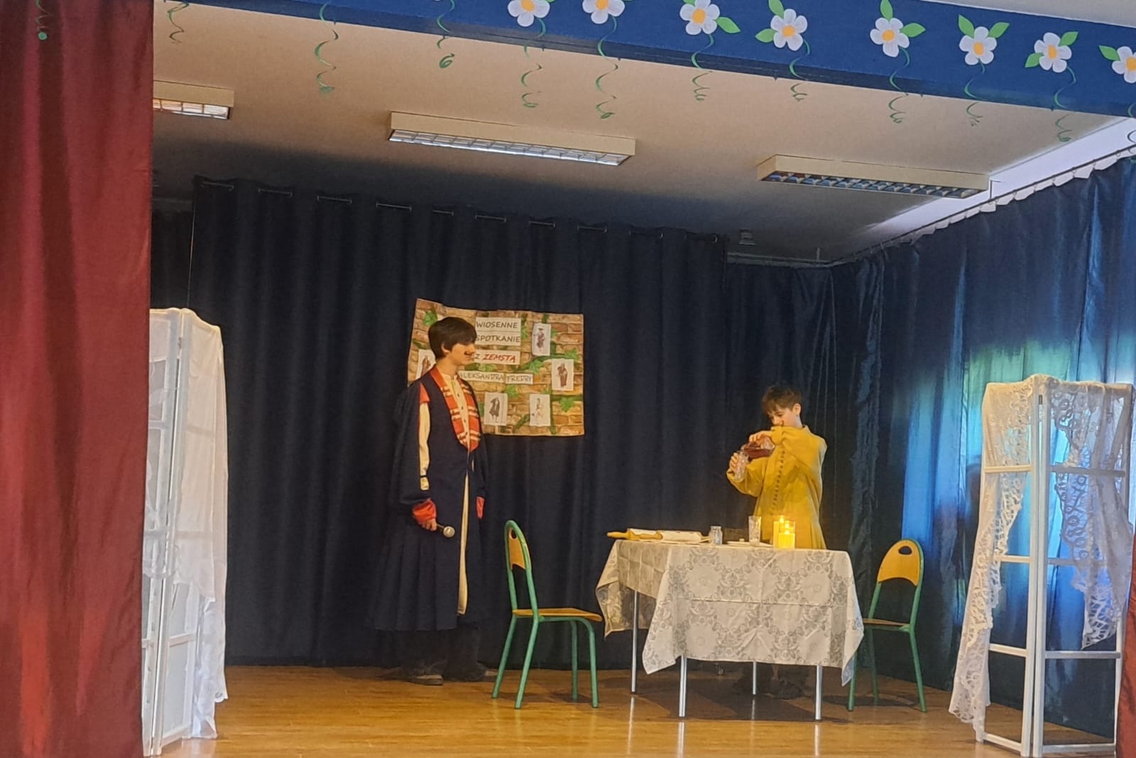 03.04.2025r. oraz 04.04.2025r. grupa aktorska niepokornych uczniów klasy 8b zaprezentowała się w scenariuszu opartym o komedię Aleksandra Fredry pt. „Zemsta”. Uczniowie przedstawili bohaterów, których autor powołał do życia w XVIII w. Pokazali obrazki z życia osiemnastowiecznej szlachty, pełnej gwałtowności, szlacheckiej buty i temperamentu.