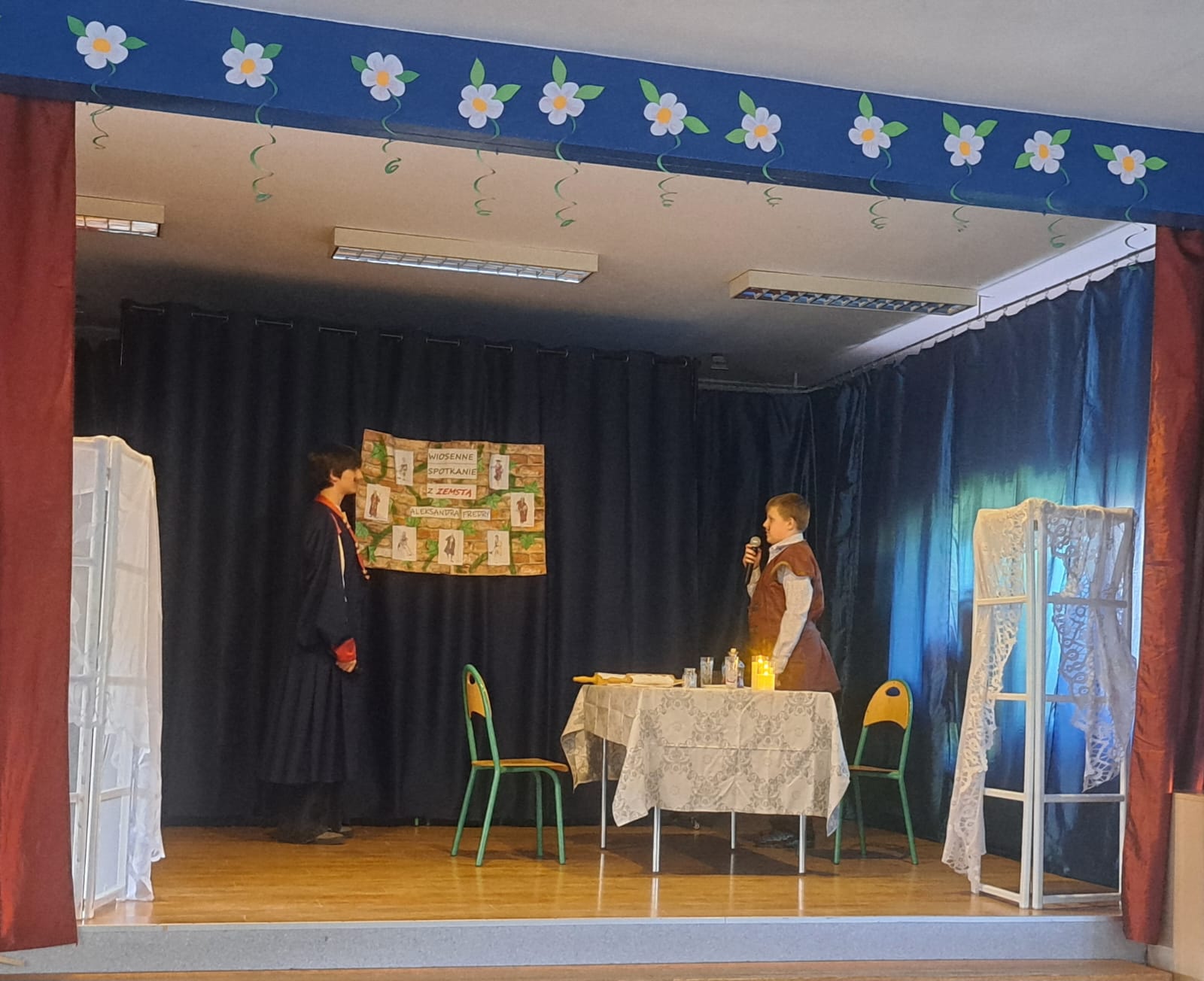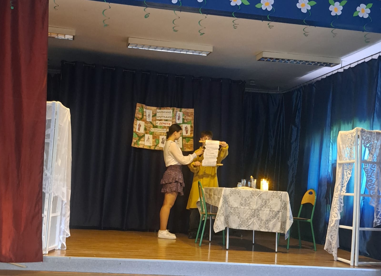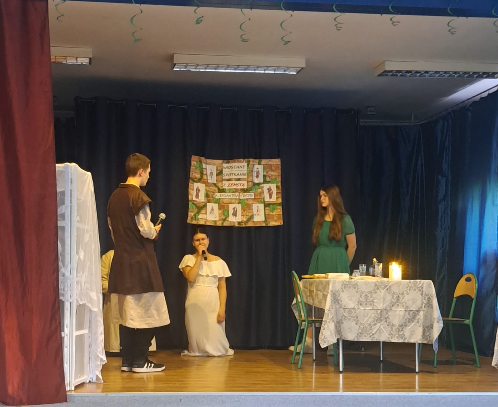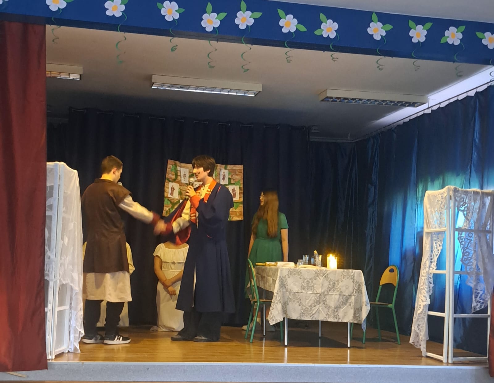 03.04.2025r. oraz 04.04.2025r. grupa aktorska niepokornych uczniów klasy 8b zaprezentowała się w scenariuszu opartym o komedię Aleksandra Fredry pt. „Zemsta”. Uczniowie przedstawili bohaterów, których autor powołał do życia w XVIII w. Pokazali obrazki z życia osiemnastowiecznej szlachty, pełnej gwałtowności, szlacheckiej buty i temperamentu.
