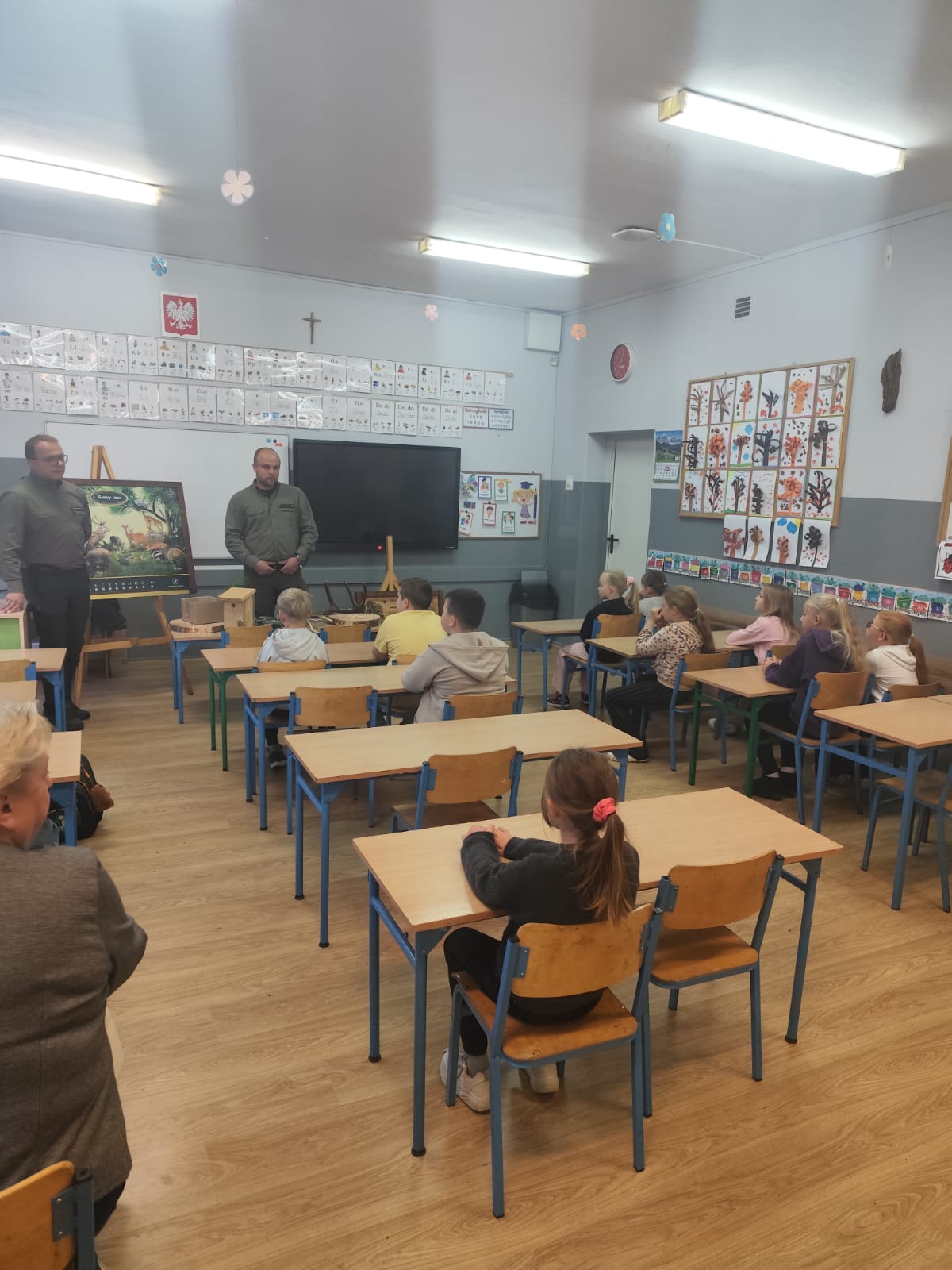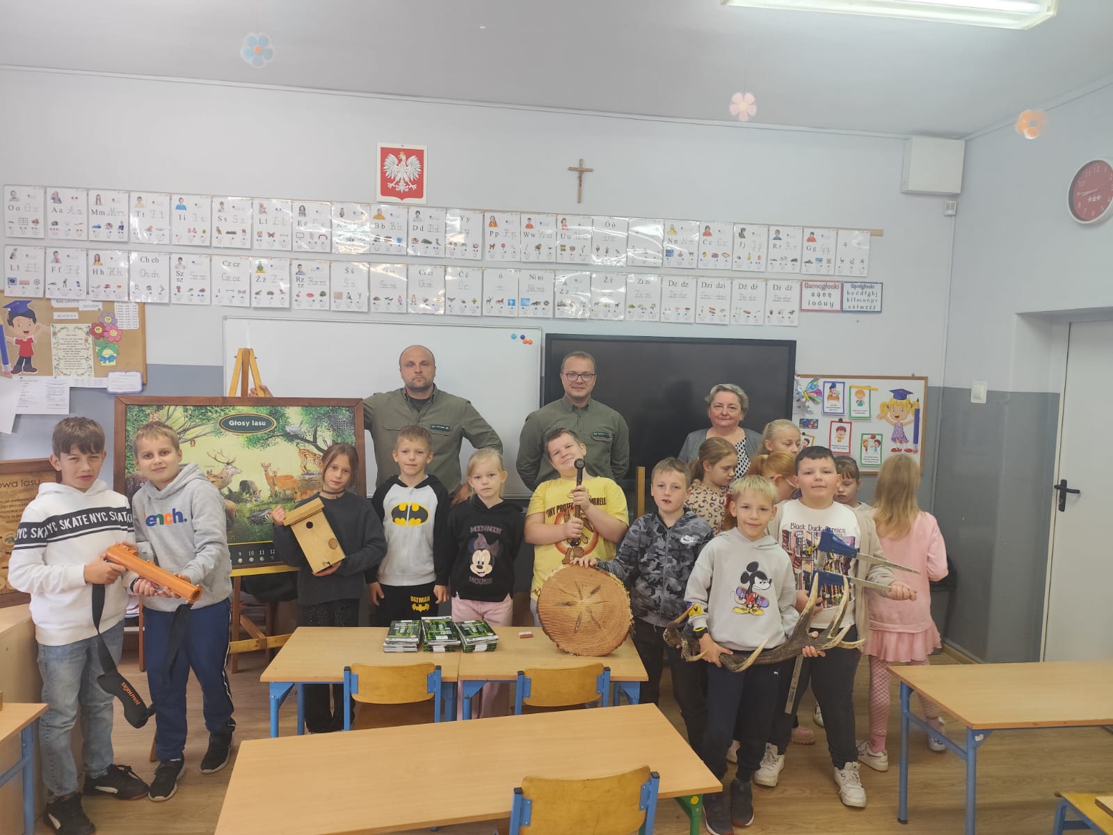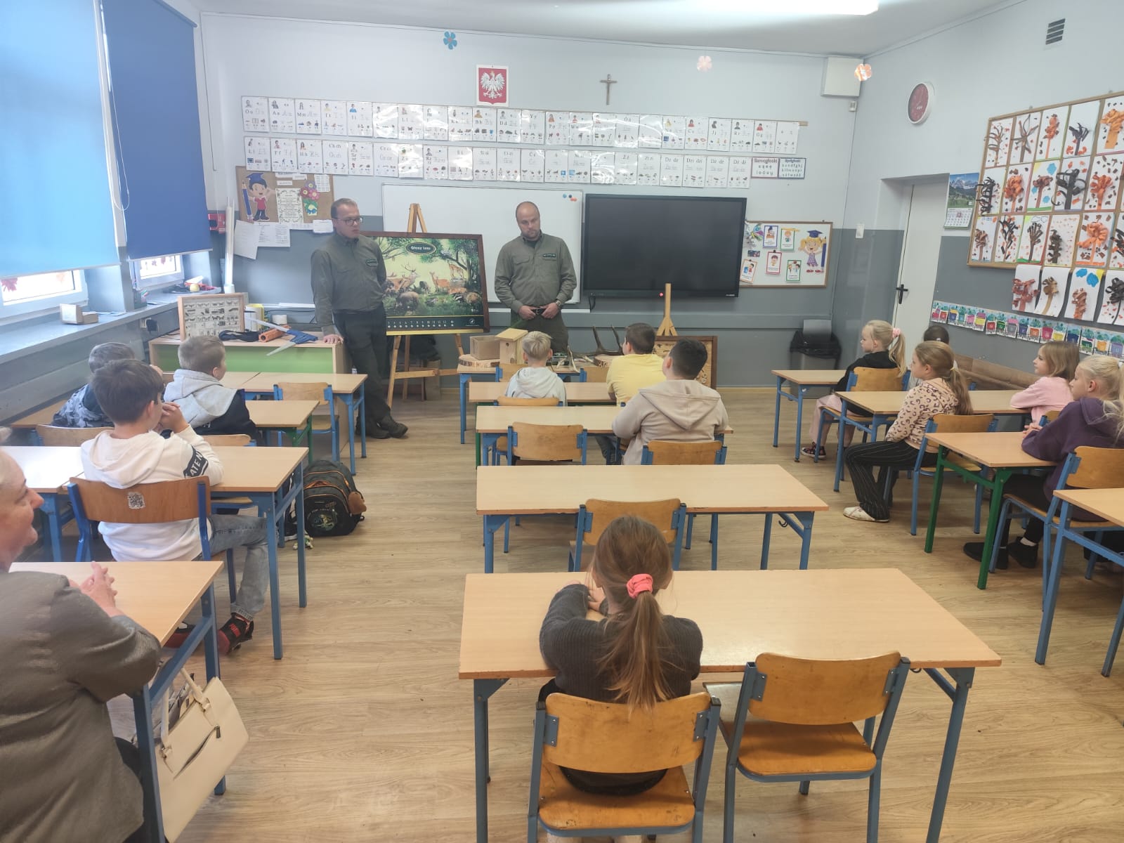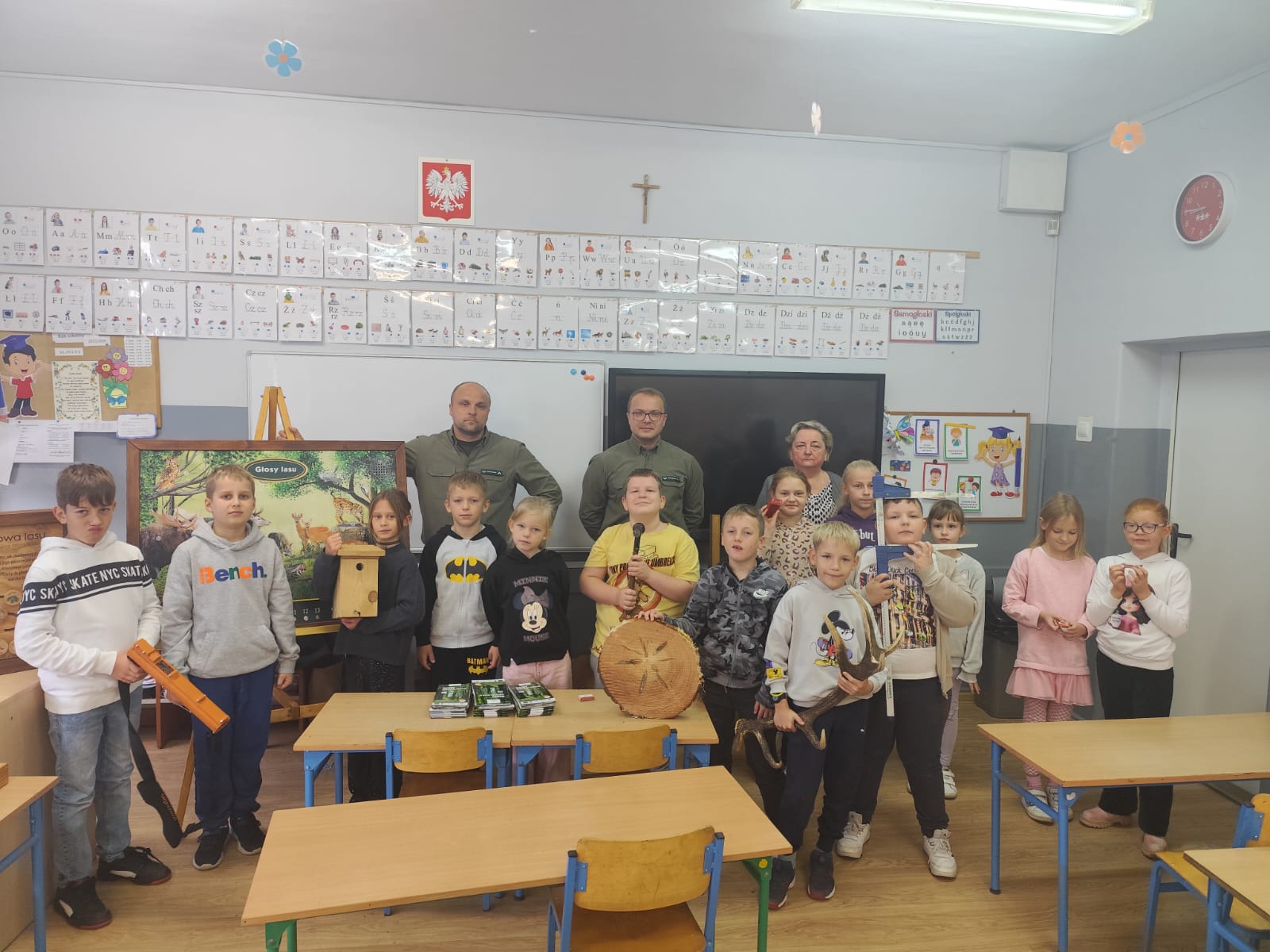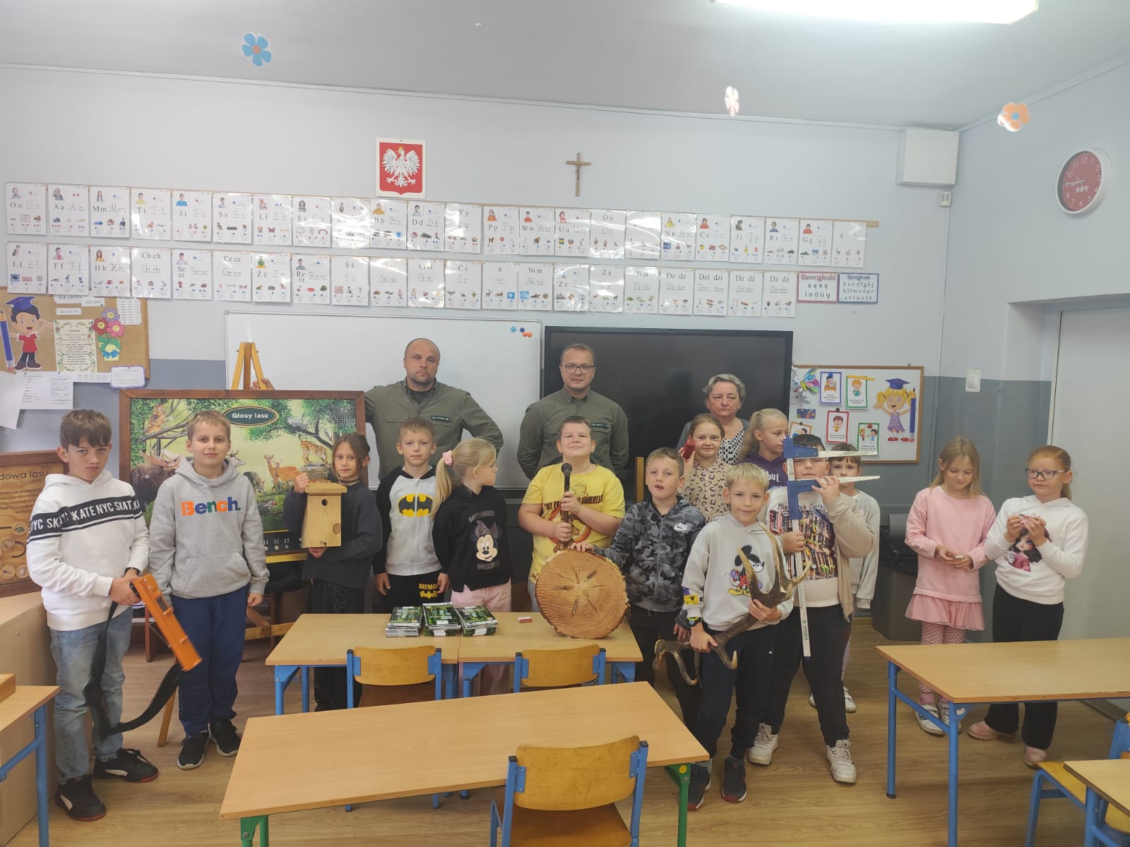 3 października uczniowie klas 3a, 3b i 3c wzięli udział w wyjątkowym spotkaniu z pracownikami Nadleśnictwa w Tułowicach. Goście w ciekawy i przystępny sposób opowiedzieli dzieciom o bogactwie przyrody naszych lasów, ich mieszkańcach oraz o znaczeniu ochrony środowiska. Uczniowie dowiedzieli się m.in., jak należy zachowywać się w lesie, dlaczego warto dbać o zieleń oraz jakie zadania na co dzień realizują leśnicy.
