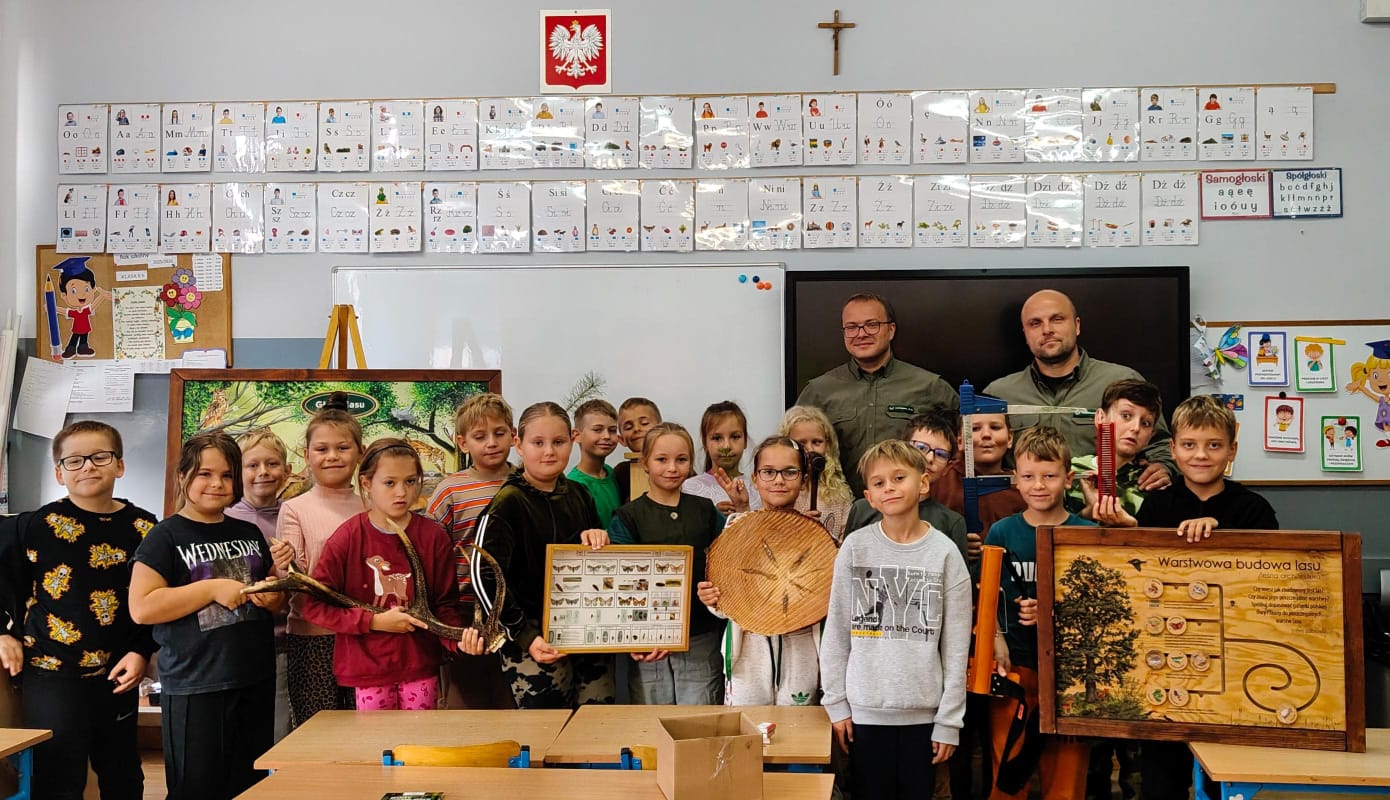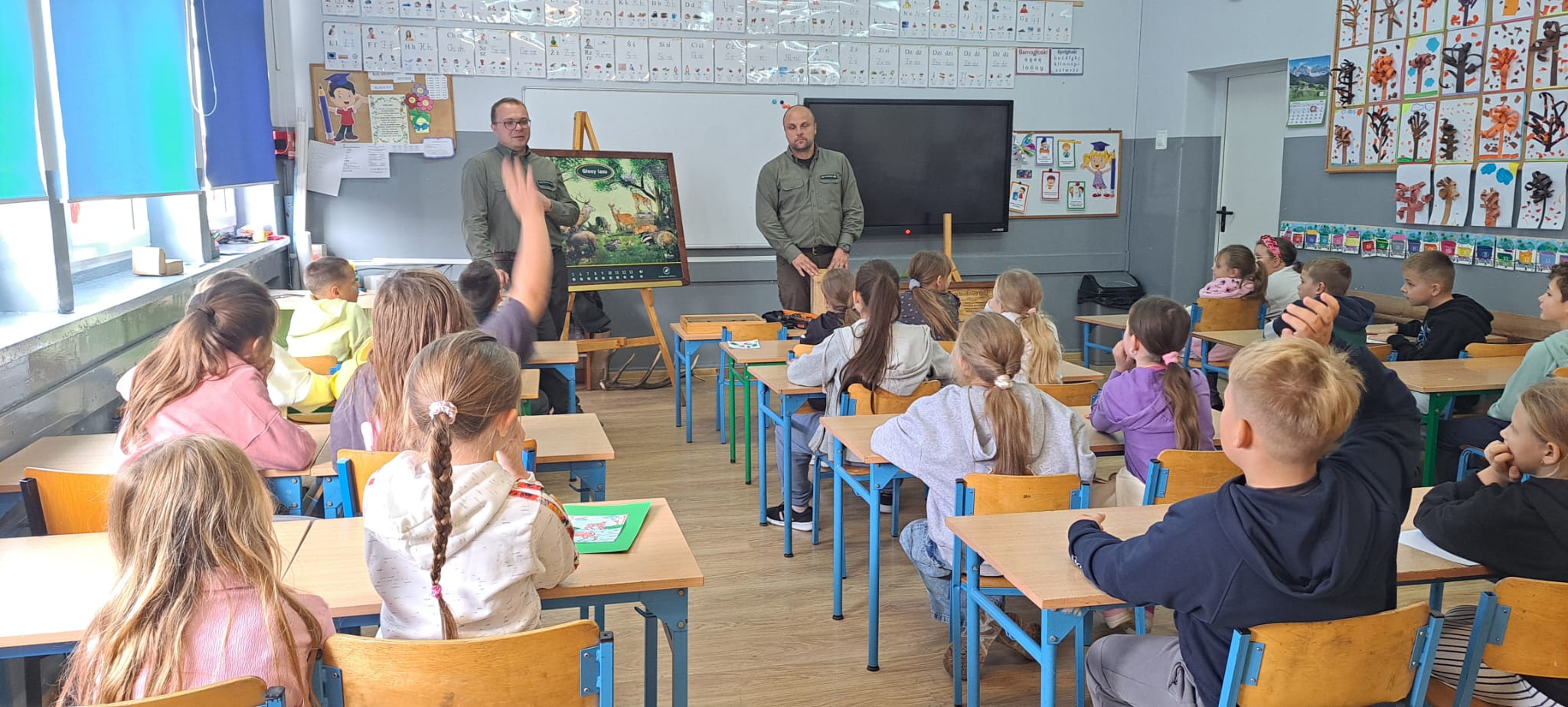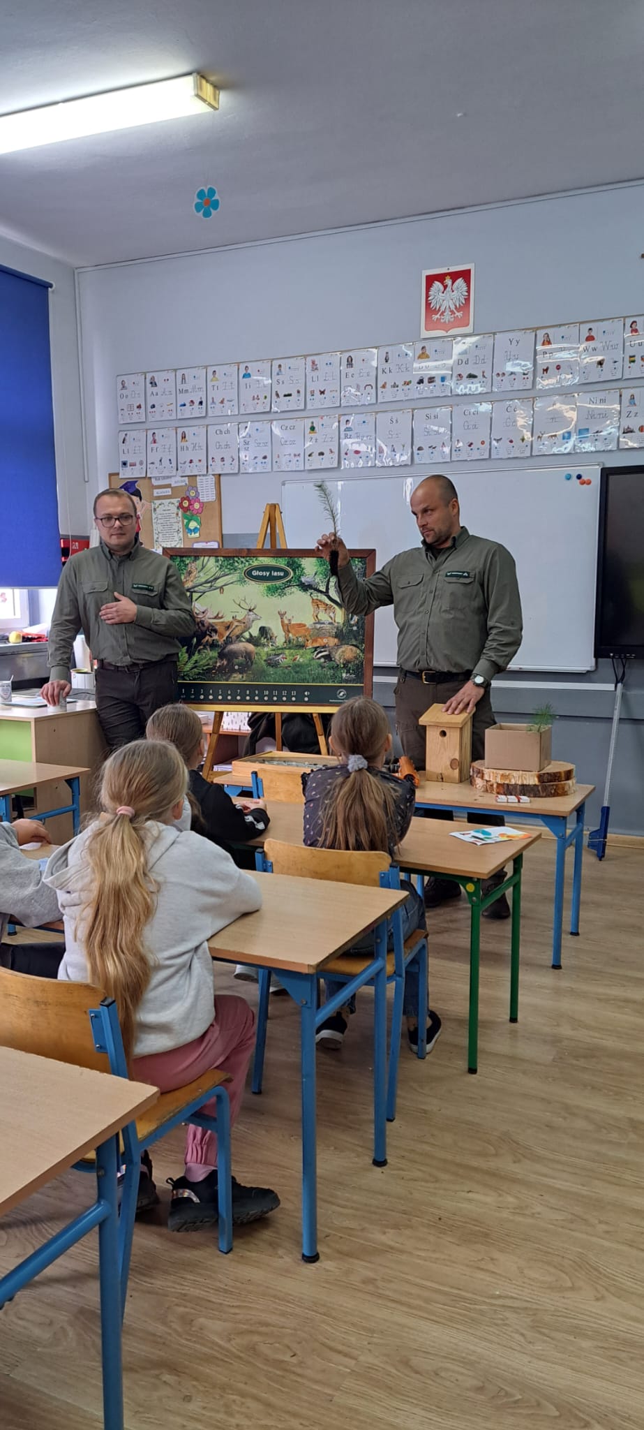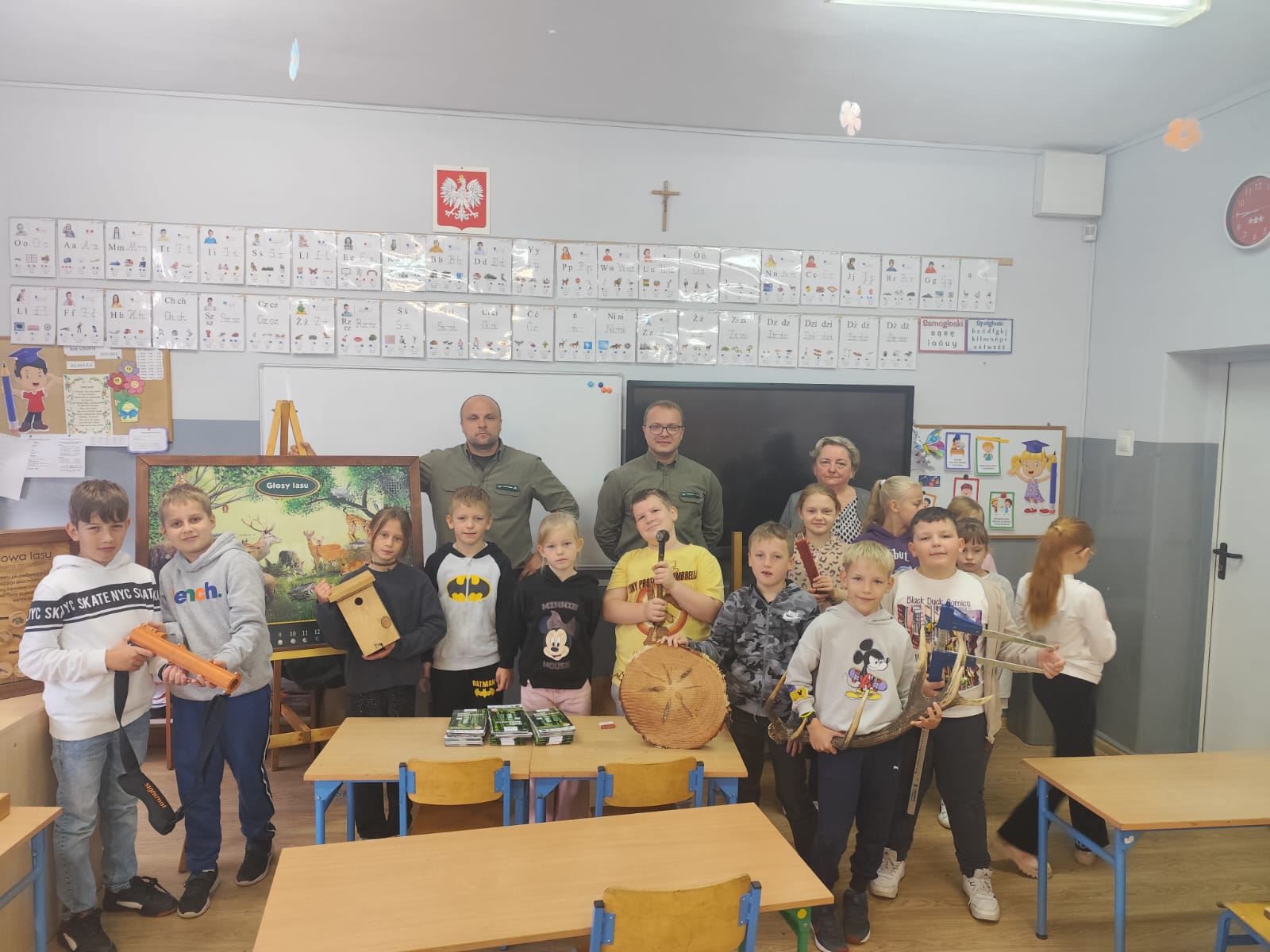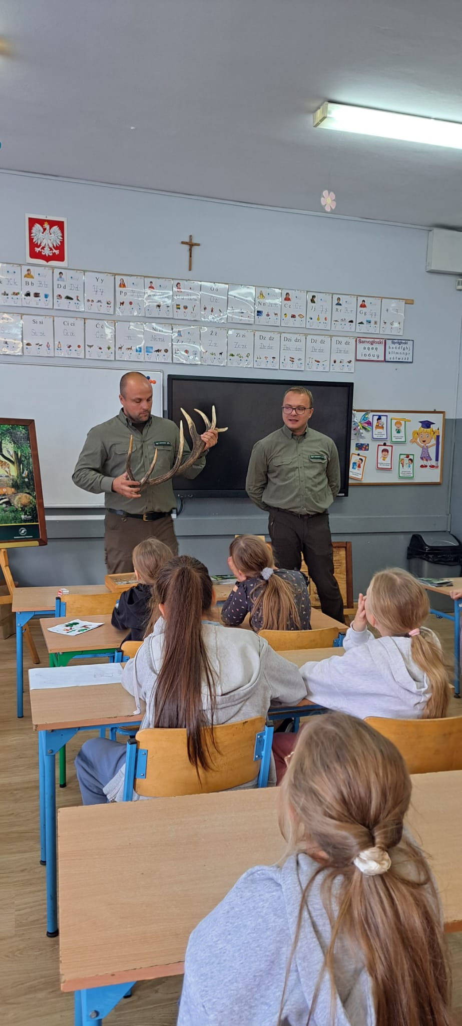 3 października uczniowie klas 3a, 3b i 3c wzięli udział w wyjątkowym spotkaniu z pracownikami Nadleśnictwa w Tułowicach. Goście w ciekawy i przystępny sposób opowiedzieli dzieciom o bogactwie przyrody naszych lasów, ich mieszkańcach oraz o znaczeniu ochrony środowiska. Uczniowie dowiedzieli się m.in., jak należy zachowywać się w lesie, dlaczego warto dbać o zieleń oraz jakie zadania na co dzień realizują leśnicy.