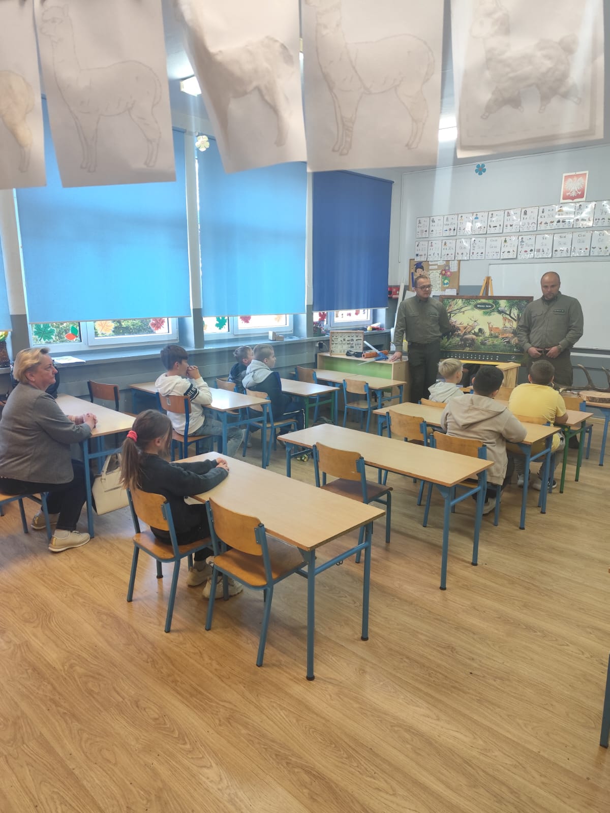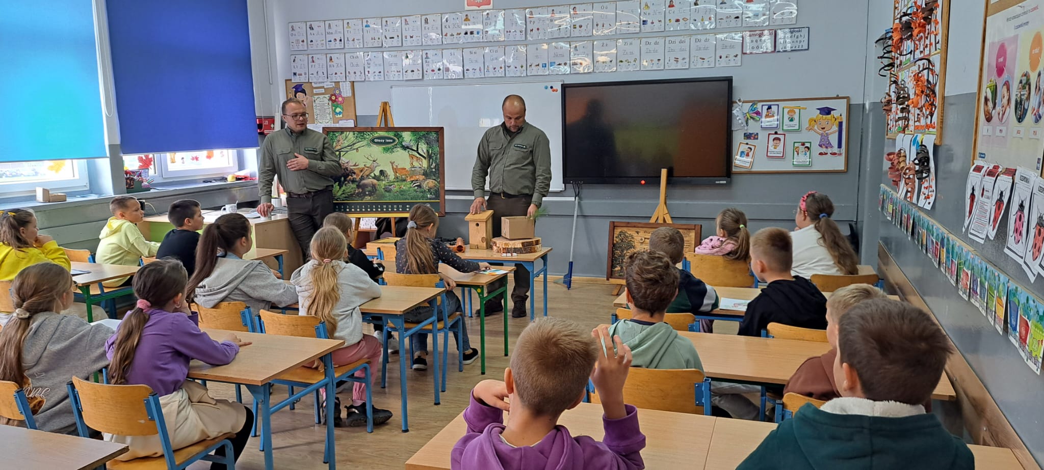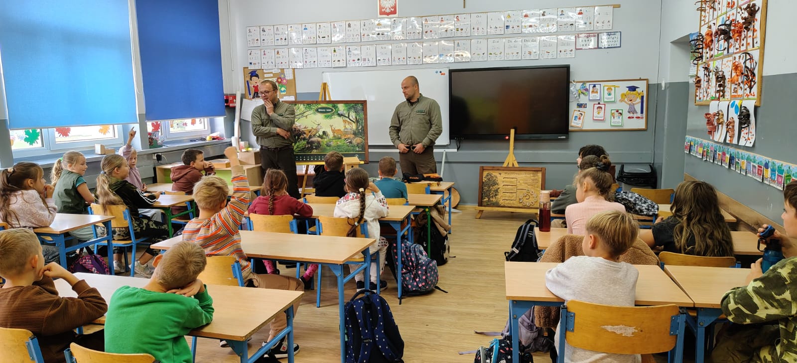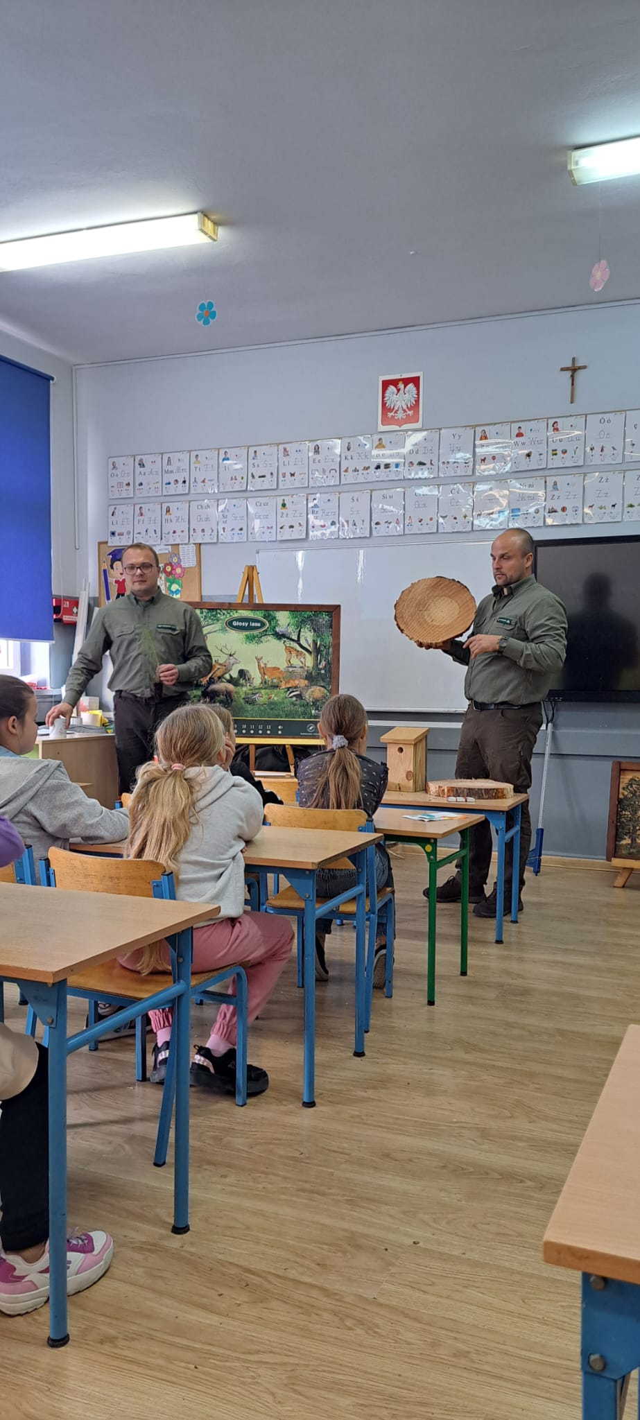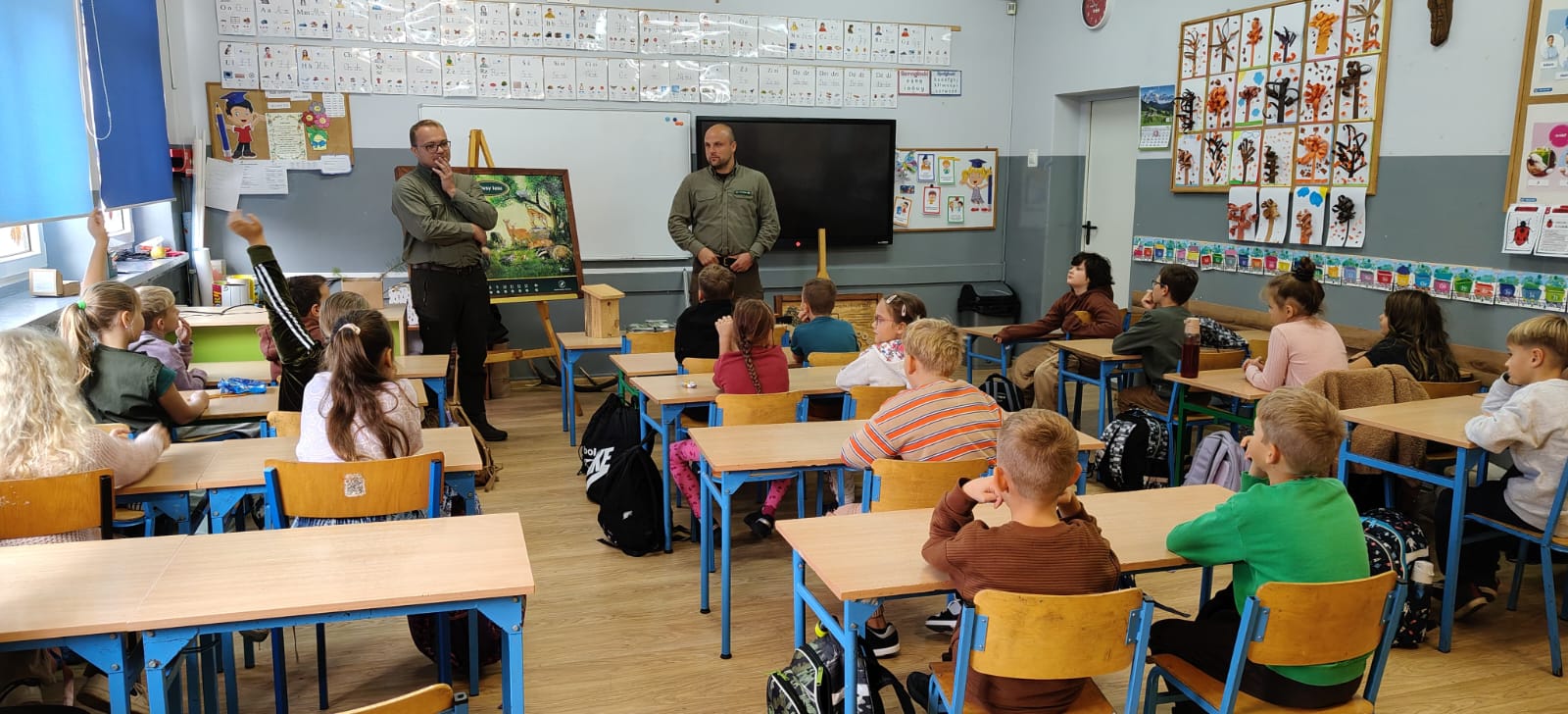 3 października uczniowie klas 3a, 3b i 3c wzięli udział w wyjątkowym spotkaniu z pracownikami Nadleśnictwa w Tułowicach. Goście w ciekawy i przystępny sposób opowiedzieli dzieciom o bogactwie przyrody naszych lasów, ich mieszkańcach oraz o znaczeniu ochrony środowiska. Uczniowie dowiedzieli się m.in., jak należy zachowywać się w lesie, dlaczego warto dbać o zieleń oraz jakie zadania na co dzień realizują leśnicy.