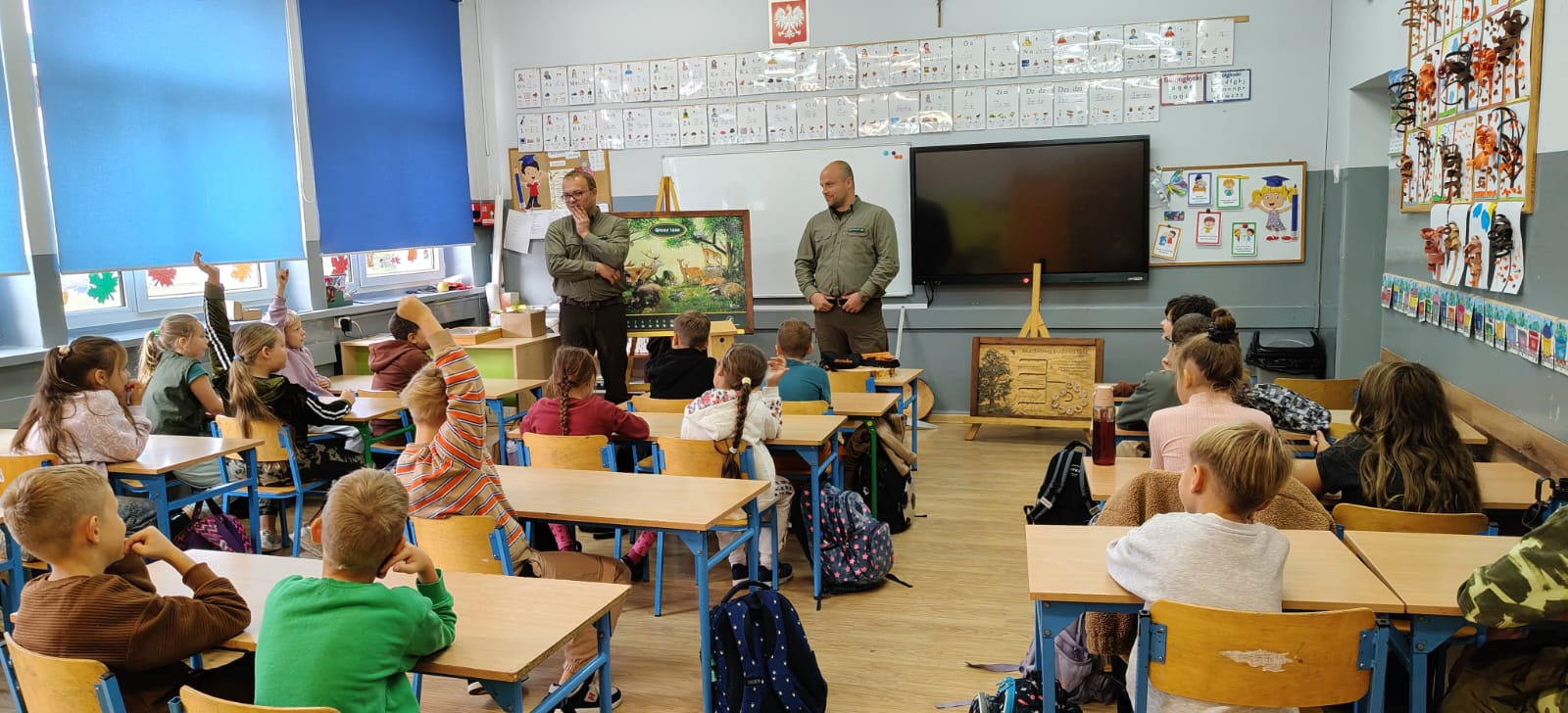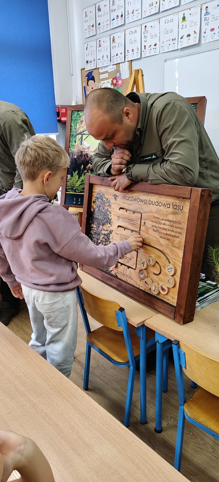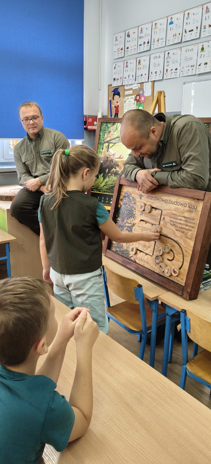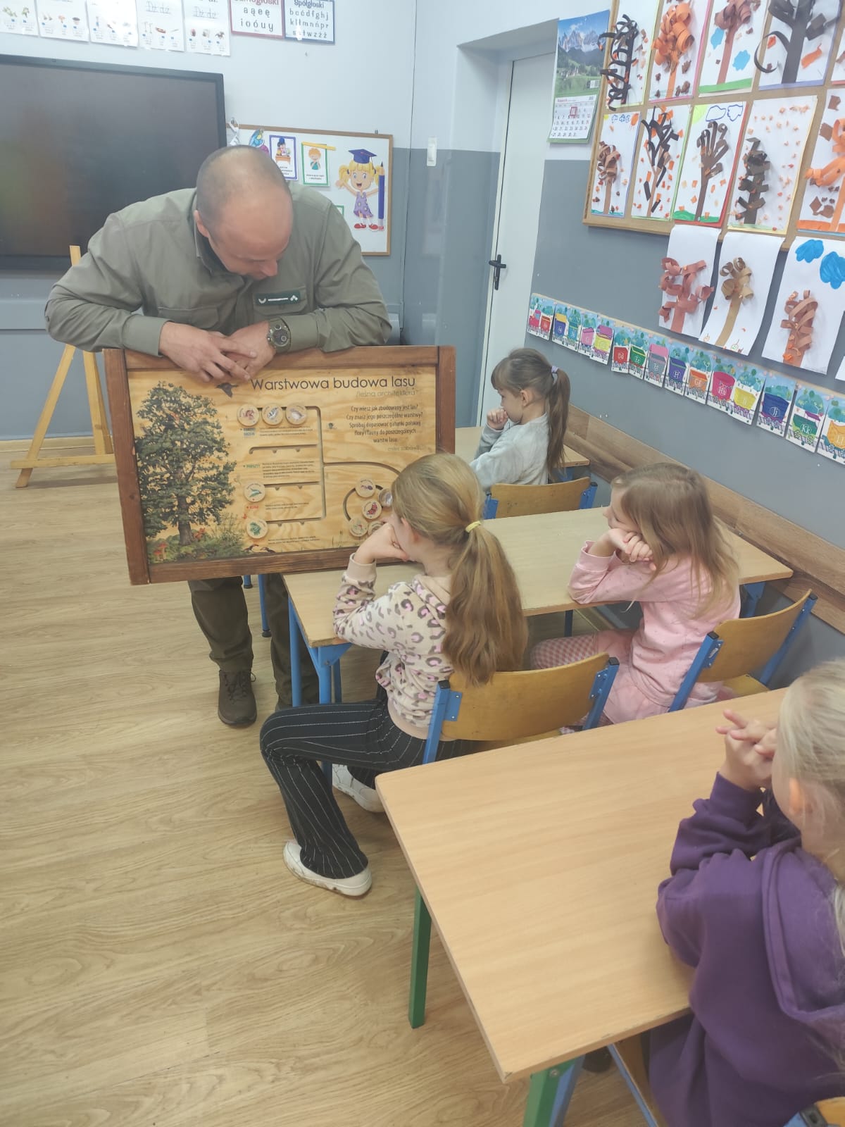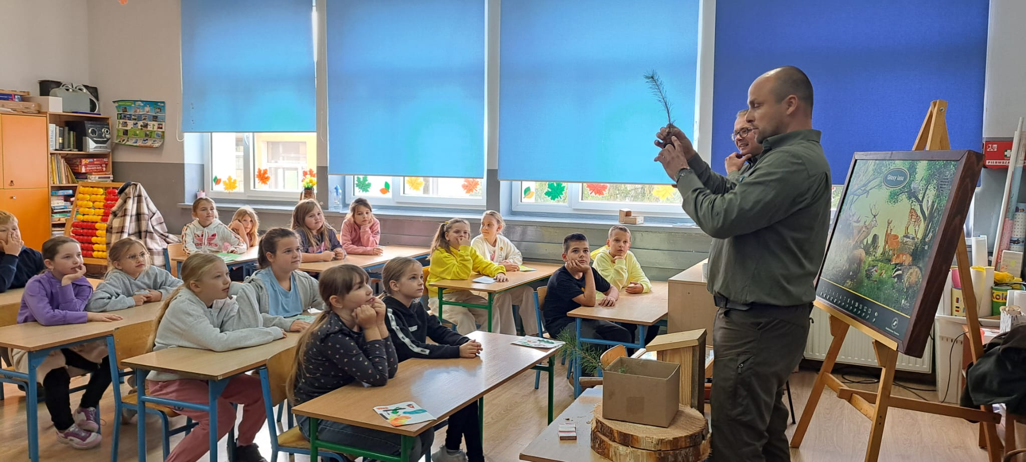 3 października uczniowie klas 3a, 3b i 3c wzięli udział w wyjątkowym spotkaniu z pracownikami Nadleśnictwa w Tułowicach. Goście w ciekawy i przystępny sposób opowiedzieli dzieciom o bogactwie przyrody naszych lasów, ich mieszkańcach oraz o znaczeniu ochrony środowiska. Uczniowie dowiedzieli się m.in., jak należy zachowywać się w lesie, dlaczego warto dbać o zieleń oraz jakie zadania na co dzień realizują leśnicy.
